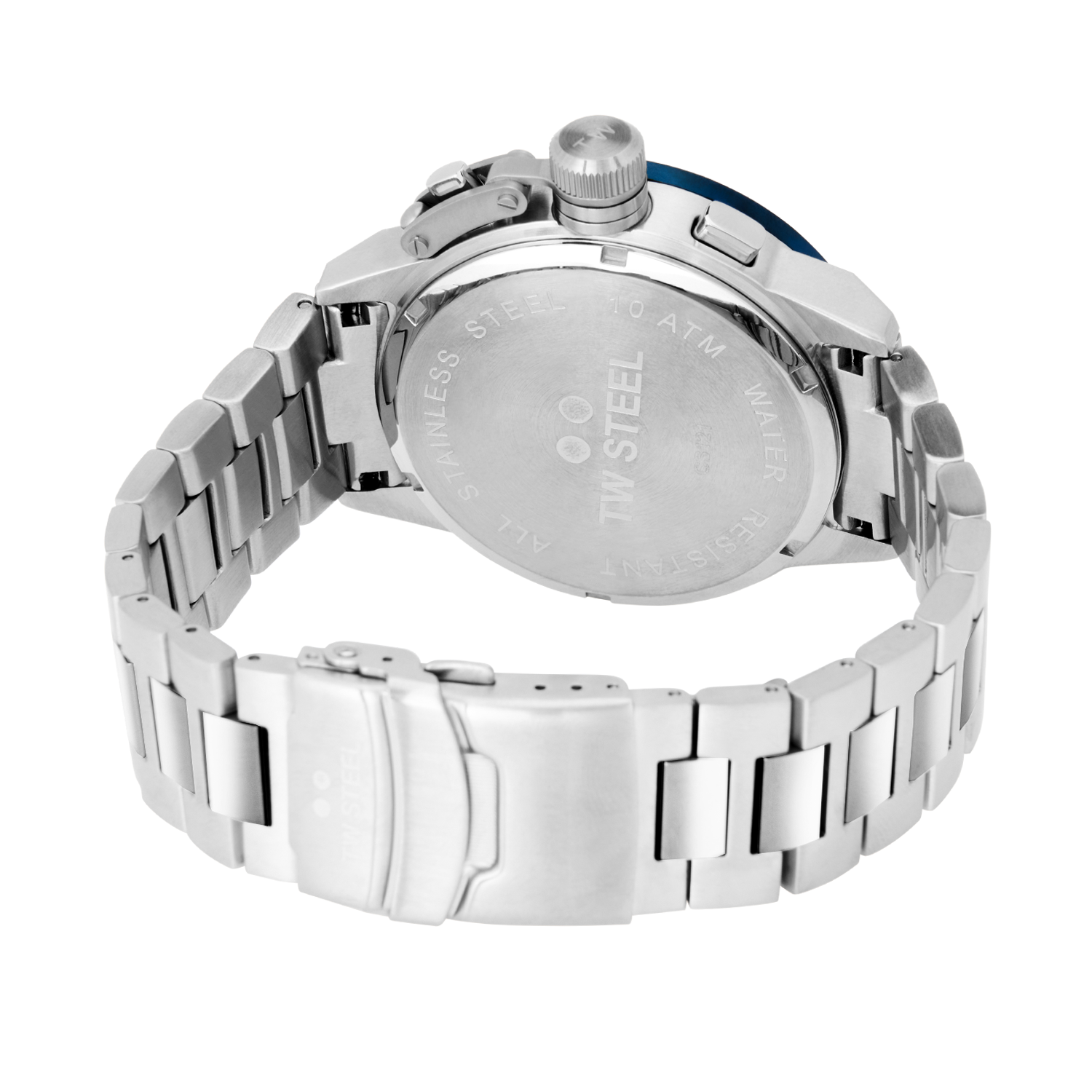 - Brushed steel case with blue plated tachymeter bezel