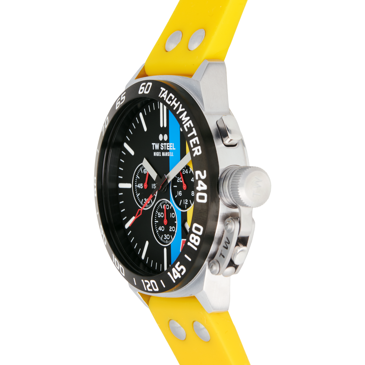 Iconic racer meets iconic watch. Inspired by Mansell's champion winning FW14B car, the CS124 features a yellow rubber strap and a characteristic dial with FW14B's colour scheme and the iconic Red 5.