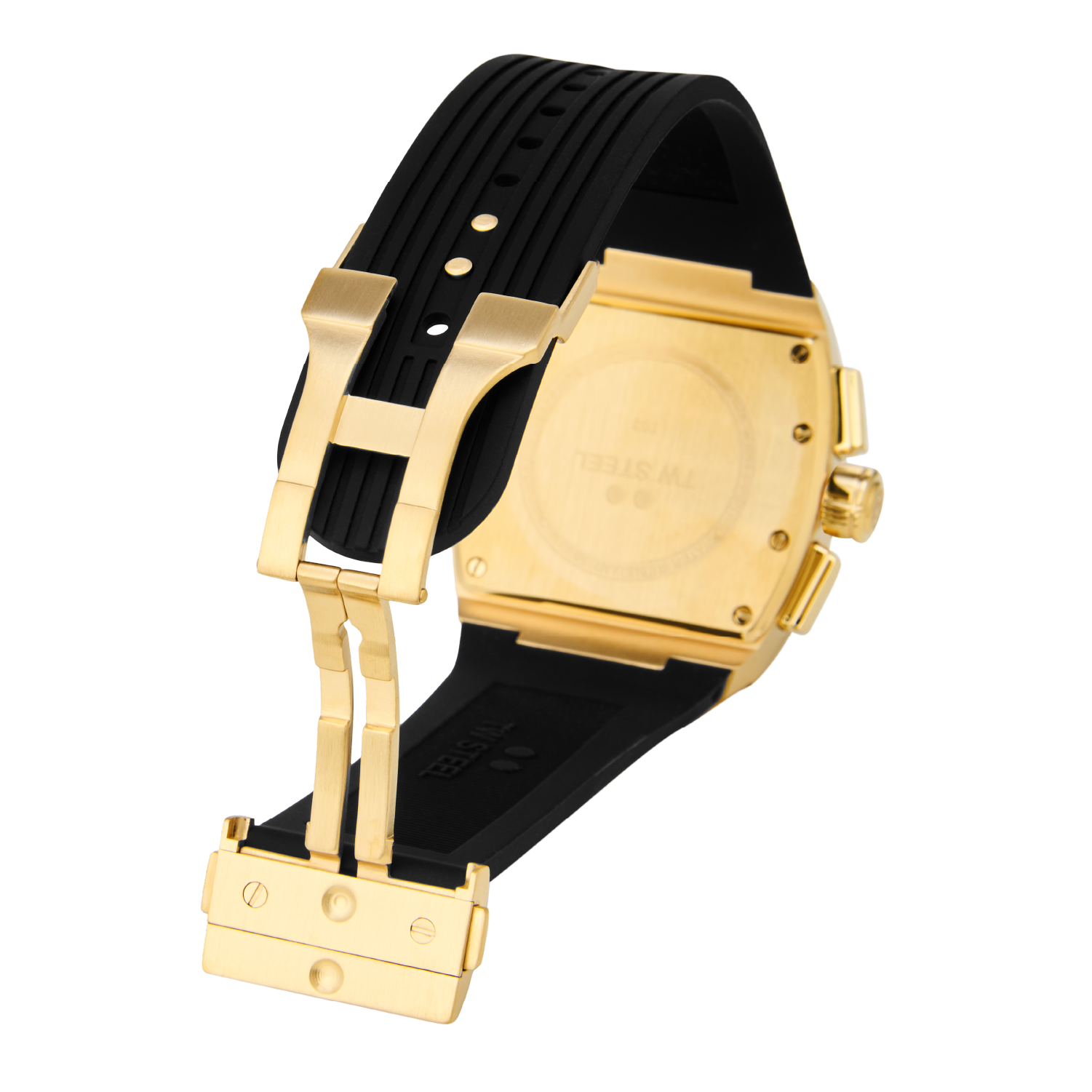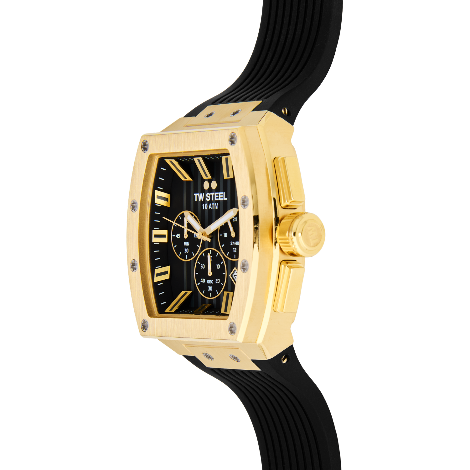 An elegant tonneau watch that never falls out of style. The TO2 features a chronograph with a PVD yellow gold case, a rubber black strap, 10 ATM and a 2-year global warranty.