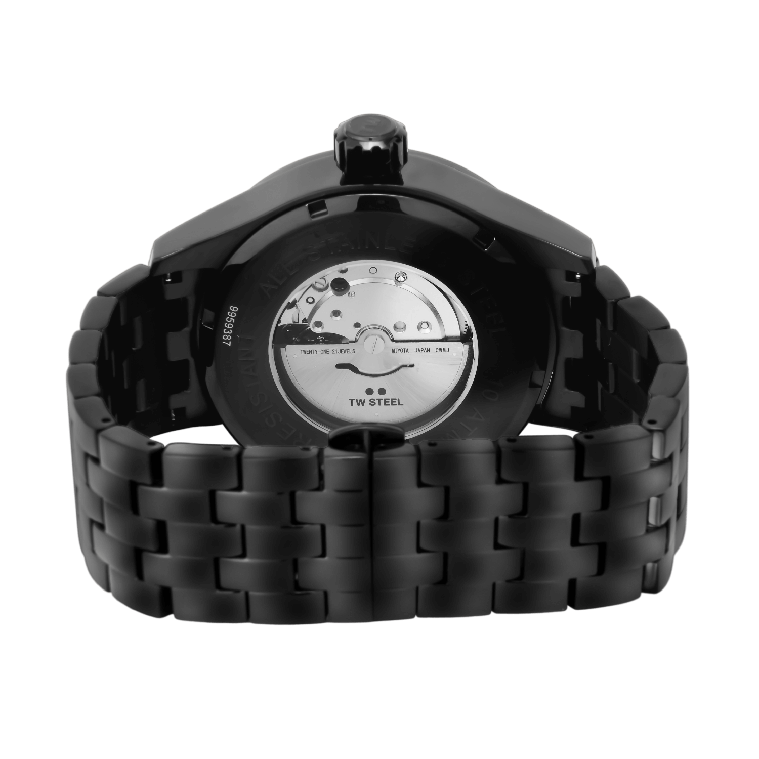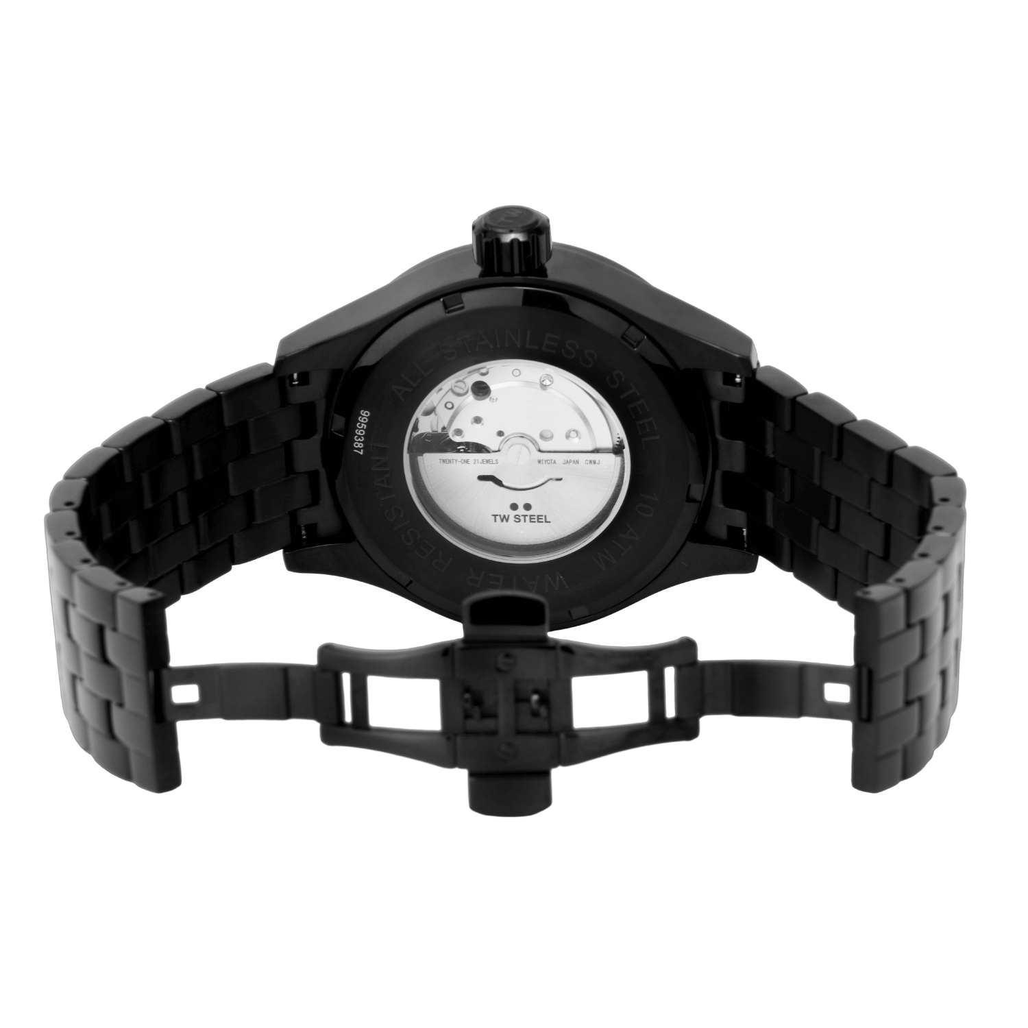 Make your move in steel. This VB12 has a black patterned dial, 45mm black PVD case, matching bracelet and a transparent caseback with TW Steel rotor. Miyota 8215 automatic.