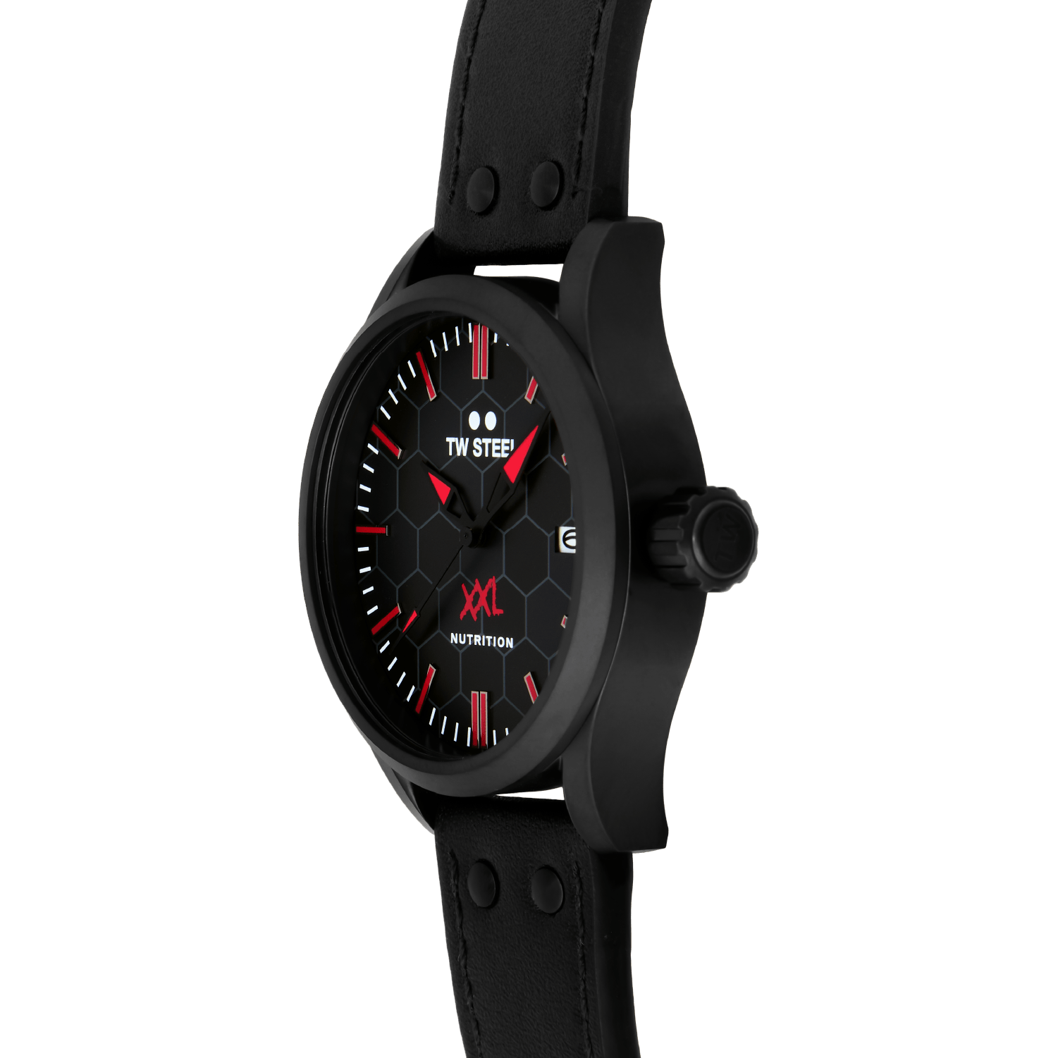 Fuel your ambition. The XXL Nutrition watch features a black hexagon dial, a matte PVD black case and bezel, a black leather strap, and is limited to 250 pieces. Crafted for bold performance and unmatched style.
